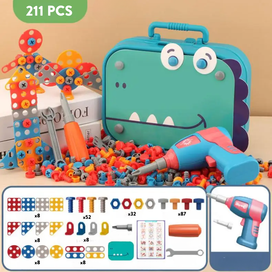 Se a ideia é juntar criatividade, concentração e muita imaginação, esse kit é a escolha certa. Com parafusos, formas, furadeira e uma maleta super fofa pra organizar tudo, ele vira o centro das atenções rapidinho. É lúdico, prático e cheio de possibilidades.