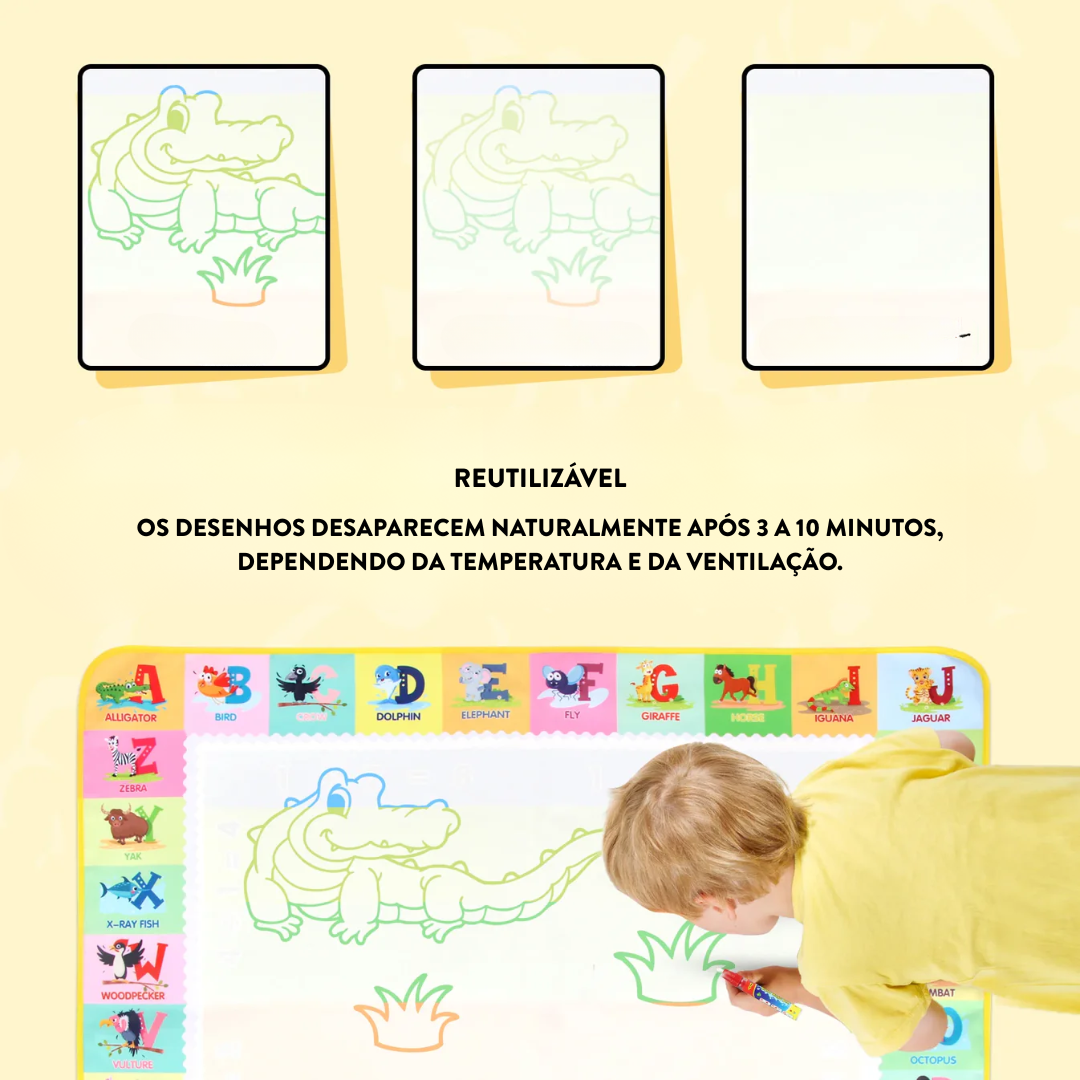 Basta encher as canetas com água e deixar a imaginação fluir. O desenho aparece como mágica e desaparece sozinho após alguns minutos, permitindo que o tapete seja reutilizado inúmeras vezes.