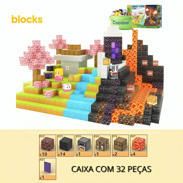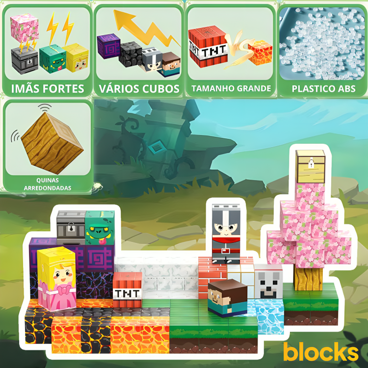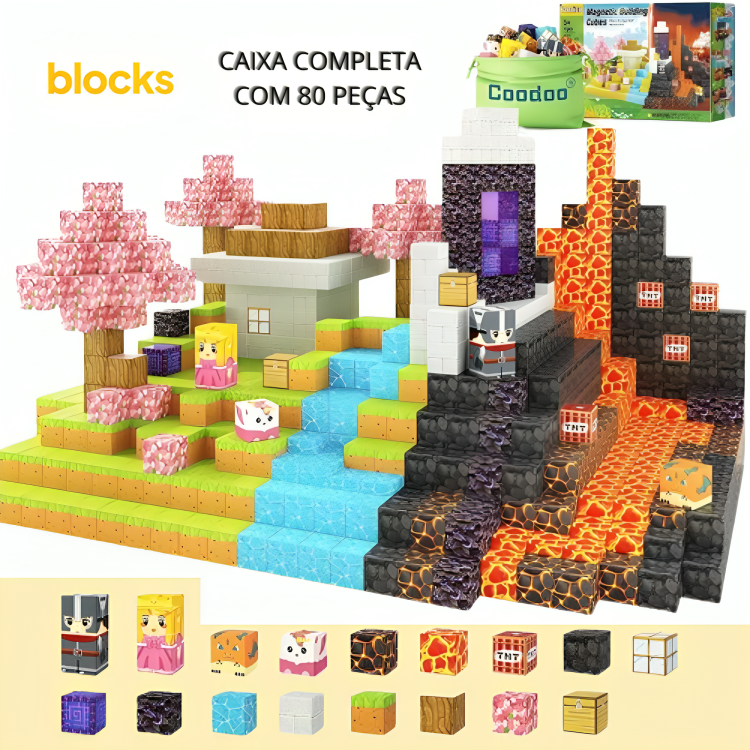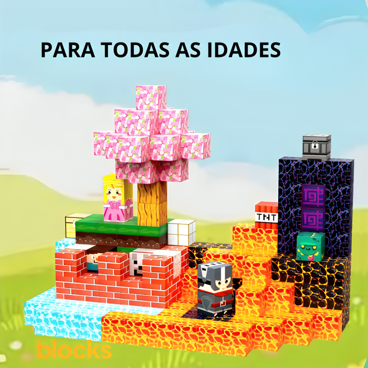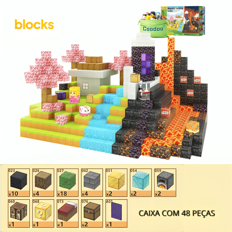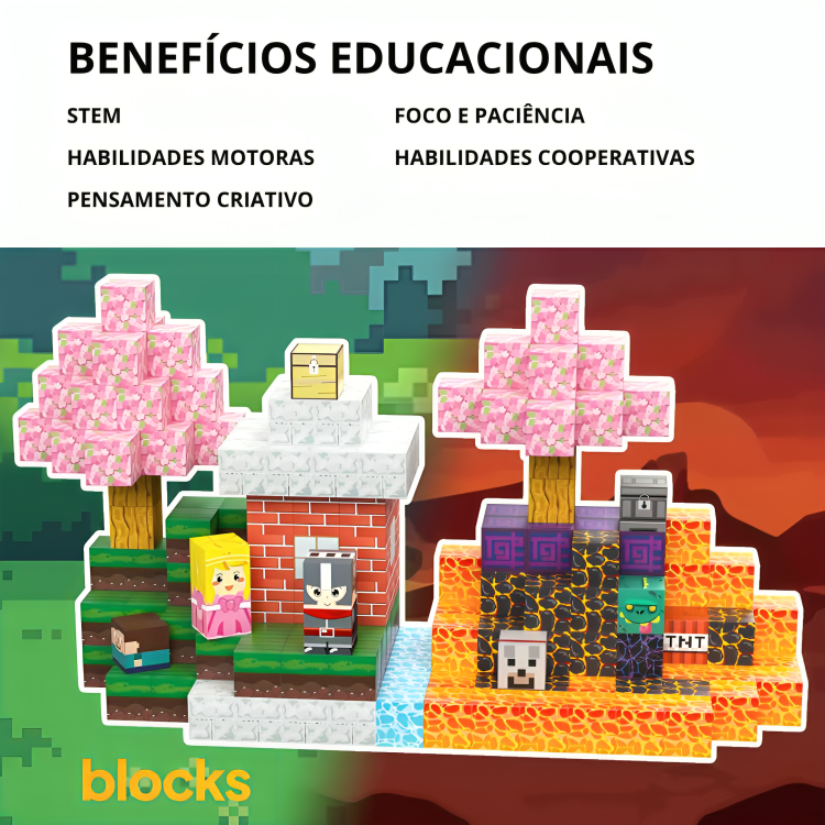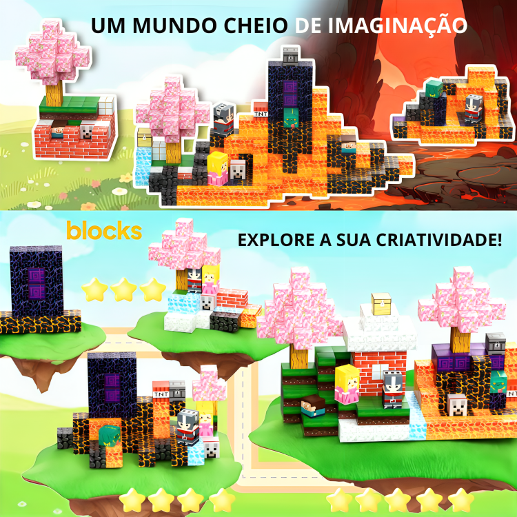 Conexão Magnética e Infinidade de Possibilidades: As peças magnéticas se conectam de forma fácil e segura, permitindo construções dinâmicas e criativas. Deixe seu filho recriar o mundo Minecraft ou imaginar novas aventuras em três dimensões!
